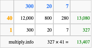 Below is an illustration showing you how to calculate 327 times 41 using the box method, using the instructions above.