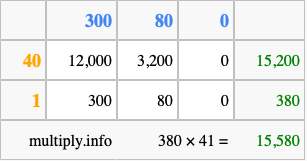 Finally, we add up all the sums we found in step 3 to get our final answer to 380 times 41.