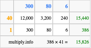 Finally, we add up all the sums we found in step 3 to get our final answer to 386 times 41.