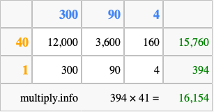 Finally, we add up all the sums we found in step 3 to get our final answer to 394 times 41.