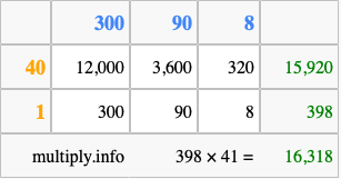 Finally, we add up all the sums we found in step 3 to get our final answer to 398 times 41.