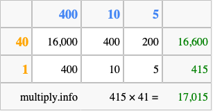 That's all there is to it! As you can see from the box above, the answer to 415 times 41 using the box method is 17,015.