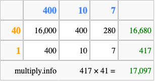 Finally, we add up all the sums we found in step 3 to get our final answer to 417 times 41.