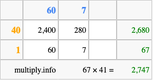 Finally, we add up all the sums we found in step 3 to get our final answer to 67 times 41.