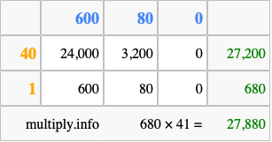 That's all there is to it! As you can see from the box above, the answer to 680 times 41 using the box method is 27,880.
