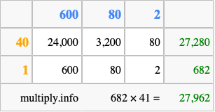 That's all there is to it! As you can see from the box above, the answer to 682 times 41 using the box method is 27,962.