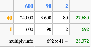 Finally, we add up all the sums we found in step 3 to get our final answer to 692 times 41.