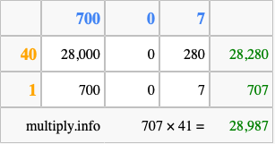 Finally, we add up all the sums we found in step 3 to get our final answer to 707 times 41.