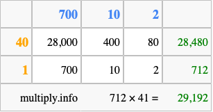 That's all there is to it! As you can see from the box above, the answer to 712 times 41 using the box method is 29,192.