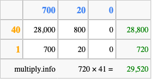 Below is an illustration showing you how to calculate 720 times 41 using the box method, using the instructions above.