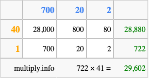 Finally, we add up all the sums we found in step 3 to get our final answer to 722 times 41.