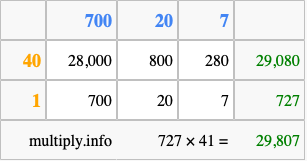 Finally, we add up all the sums we found in step 3 to get our final answer to 727 times 41.