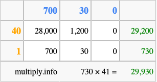 That's all there is to it! As you can see from the box above, the answer to 730 times 41 using the box method is 29,930.
