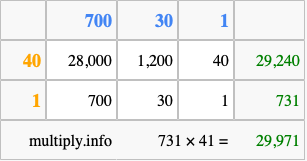 That's all there is to it! As you can see from the box above, the answer to 731 times 41 using the box method is 29,971.