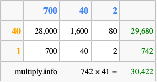 Finally, we add up all the sums we found in step 3 to get our final answer to 742 times 41.