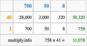 Finally, we add up all the sums we found in step 3 to get our final answer to 758 times 41.