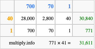 That's all there is to it! As you can see from the box above, the answer to 771 times 41 using the box method is 31,611.