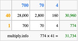 That's all there is to it! As you can see from the box above, the answer to 774 times 41 using the box method is 31,734.