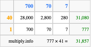 Finally, we add up all the sums we found in step 3 to get our final answer to 777 times 41.