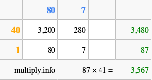 Finally, we add up all the sums we found in step 3 to get our final answer to 87 times 41.