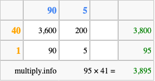That's all there is to it! As you can see from the box above, the answer to 95 times 41 using the box method is 3,895.