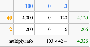That's all there is to it! As you can see from the box above, the answer to 103 times 42 using the box method is 4,326.