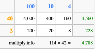 That's all there is to it! As you can see from the box above, the answer to 114 times 42 using the box method is 4,788.