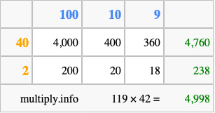 That's all there is to it! As you can see from the box above, the answer to 119 times 42 using the box method is 4,998.