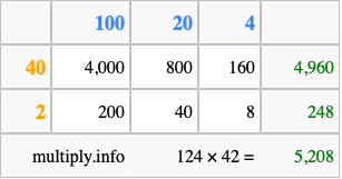 That's all there is to it! As you can see from the box above, the answer to 124 times 42 using the box method is 5,208.