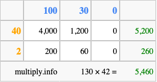 Finally, we add up all the sums we found in step 3 to get our final answer to 130 times 42.