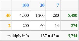 That's all there is to it! As you can see from the box above, the answer to 137 times 42 using the box method is 5,754.