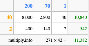 That's all there is to it! As you can see from the box above, the answer to 271 times 42 using the box method is 11,382.
