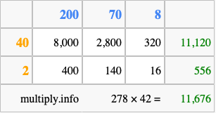 Below is an illustration showing you how to calculate 278 times 42 using the box method, using the instructions above.