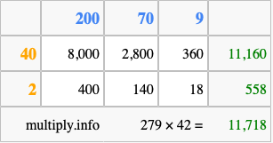 That's all there is to it! As you can see from the box above, the answer to 279 times 42 using the box method is 11,718.