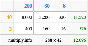 Finally, we add up all the sums we found in step 3 to get our final answer to 288 times 42.