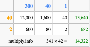 Below is an illustration showing you how to calculate 341 times 42 using the box method, using the instructions above.