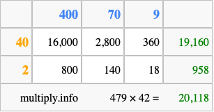 That's all there is to it! As you can see from the box above, the answer to 479 times 42 using the box method is 20,118.