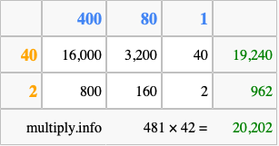 Finally, we add up all the sums we found in step 3 to get our final answer to 481 times 42.