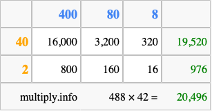 Finally, we add up all the sums we found in step 3 to get our final answer to 488 times 42.