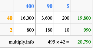 That's all there is to it! As you can see from the box above, the answer to 495 times 42 using the box method is 20,790.
