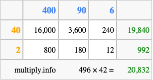 That's all there is to it! As you can see from the box above, the answer to 496 times 42 using the box method is 20,832.