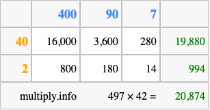 That's all there is to it! As you can see from the box above, the answer to 497 times 42 using the box method is 20,874.