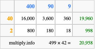 That's all there is to it! As you can see from the box above, the answer to 499 times 42 using the box method is 20,958.