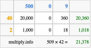 That's all there is to it! As you can see from the box above, the answer to 509 times 42 using the box method is 21,378.