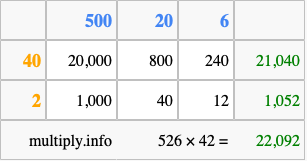 Below is an illustration showing you how to calculate 526 times 42 using the box method, using the instructions above.