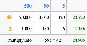 That's all there is to it! As you can see from the box above, the answer to 593 times 42 using the box method is 24,906.