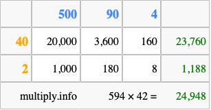 That's all there is to it! As you can see from the box above, the answer to 594 times 42 using the box method is 24,948.