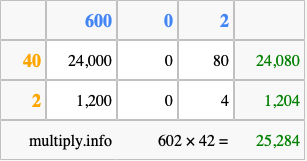 That's all there is to it! As you can see from the box above, the answer to 602 times 42 using the box method is 25,284.
