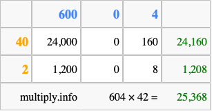 That's all there is to it! As you can see from the box above, the answer to 604 times 42 using the box method is 25,368.