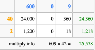 Below is an illustration showing you how to calculate 609 times 42 using the box method, using the instructions above.